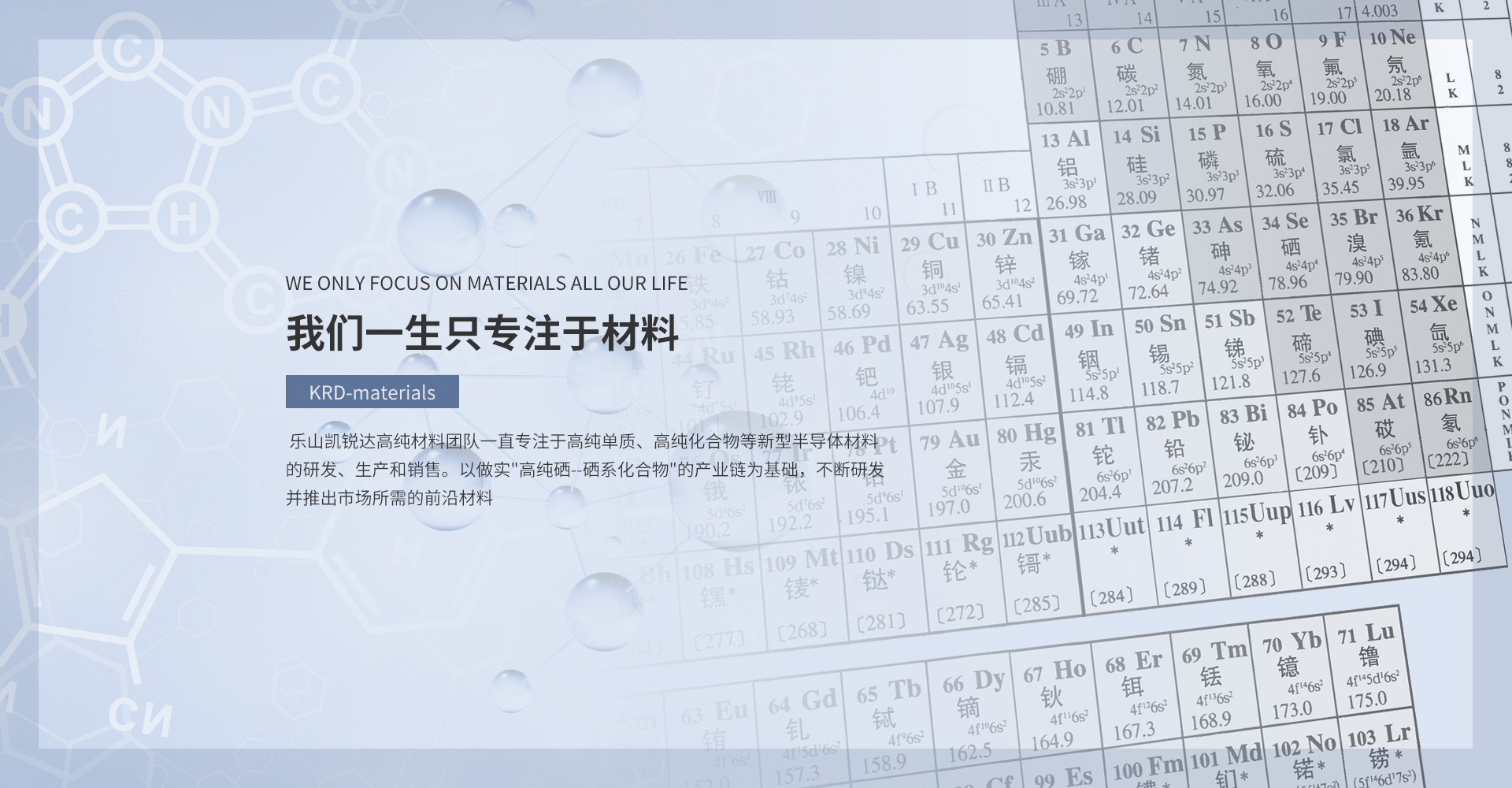 樂山凱銳達高純材料團隊一直專注于高純單質、高純化合物等新型半導體材料的研發(fā)、生產和銷售。以做實"高純硒--硒系化合物"的產業(yè)鏈為基礎,不斷研發(fā)并推出市場所需的前沿材料。專業(yè)人才與技術方面的優(yōu)勢,為公司的技術創(chuàng)新、產品開發(fā)和產業(yè)化發(fā)展,打下了堅實的基礎。至今,研制的高純材料多達300余種,在國內高純領域處于領先地位。